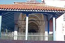 On the outside, the mosque is fronted by a double narthex with an outer and inner portico. The inner portico is covered by seven domes and supported by eight columns, while the outer portico is covered by a sloped lead roof supported on more columns.[3]