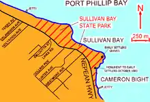 Sullivan Bay lies 60 km (37 mi) due south of Melbourne on Port Phillip, one kilometre (0.6 mi) east of Sorrento, Victoria. It was established as a short-lived convict settlement in 1803 by Lieutenant-Colonel David Collins,[1] who named the bay after the Under-Secretary of State for War and the Colonies, John Sullivan.