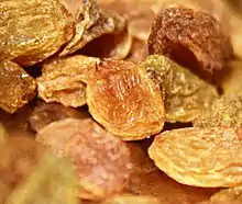 The sultana is a "white" (pale green), oval seedless grape variety also called the sultanina, Thompson Seedless (United States), Lady de Coverly (England), and oval-fruited Kishmish (Iraq, Iran, Israel, Palestine, Pakistan, Afghanistan, India).[1] It is also known as İzmir üzümü (grape of İzmir) in Turkey since this variety has been extensively grown in the region around İzmir. It is assumed to originate from Asia Minor, which later became part of the Ottoman Empire.[1]