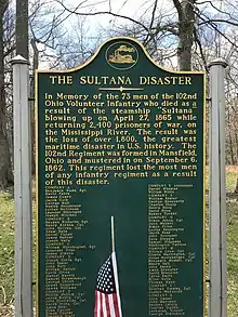 - ↑ "Sultana Tragedy". Historical Marker Database. Retrieved 24 September 2015.