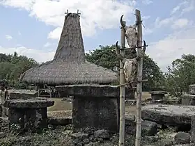 Sumba Island contains several cultural and linguistic groups, however all share a common architectural heritage. Animism is strong in Sumbanese society. Their indigenous religion focused on the marapu. Marapu includes spirits of the dead, of sacred places, of heirloom objects and the instruments used to communicate with the spirit world.[2] This concept affects the architectural space within the Sumbanese house and the Sumbanese village. There are two main houses of the Sumbanese people. The most characteristic Sumbanese house is the uma mbatangu ("peaked house") of eastern Sumba which features a high central peak. This roof is made of thatched alang-alang and is somewhat similar to the central peak of a Javanese joglo, although much more high-pitched. The biggest peaked-house of Sumbanese people is known as uma bungguru (Sumbanese "house of the fellowship"). The house is the main house of the clan where important rituals relating with the unity of the clan are held, e.g. wedding ceremonies, funeral, and so on. The big house is also the permanent residence of the oldest person of the village.[1] Other type of house is uma kamadungu ("bald house") which contains no central peak. The peak-less house is considered not 'hot' for a ritual, and so they are also known uma maringu or "cool house".[3]
