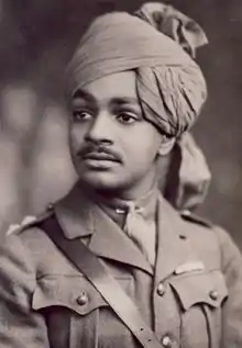Upon the outbreak of the First World War, the young Maharaja volunteered to serve in combat and was commissioned as an honorary Lieutenant in the British Army in October 1914.[1] On 26 February 1916, a month after he had come of age, Sumer Singh was granted full ruling powers by the Viceroy, Lord Hardinge, in person. Shortly after, he left India for the battlefields of the Western Front, leading the Jodhpur Imperial Service Lancers in combat in France and Flanders. He was promoted to the rank of an honorary Major in the British Army in 1917.[2] For his services, Sumer Singh was decorated and subsequently knighted as a Knight Commander of the Order of the British Empire (KBE) in 1918.[3]