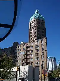 The Sun Tower is a 17 storey 82 m (269 ft) Beaux-Arts building at 128 West Pender Street in Vancouver, British Columbia. It was known for its faux-patina steel dome painted to imitate copper cladding. In early February 2021 a newly finished roof clad in real penny-coloured copper tiles was revealed. The new roof was a part of restoration work that began on the heritage building in 2018.[4] Nine nude muses, the "nine maidens" supporting the cornice line can be seen. The terracotta for this building, including the ladies, was made in Tamworth, Staffordshire, England by Gibbs and Canning Limited.