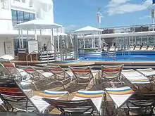 A sunlounger (British "sun lounger") is a chair-like device, typically placed in a patio, garden, or swimming pool deck, or used as beach-side outdoor furniture.[1]