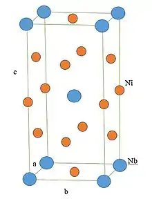- Gamma double prime (γ"): This phase typically is Ni3Nb or Ni3V and is used to strengthen Ni-based superalloys at lower temperatures (<650 °C) relative to γ'. The crystal structure of γ" is body-centered tetragonal (BCT), and the phase precipitates as 60 nm by 10 nm discs with the (001) planes in γ" parallel to the {001} family in γ. These anisotropic discs form as a result of lattice mismatch between the BCT precipitate and the FCC matrix. This lattice mismatch leads to high coherency strains which, together with order hardening, are the primary strengthening mechanisms. The γ" phase is unstable above approximately 650 °C.[20]