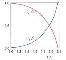 Below the lambda line the liquid can be described by the so-called two-fluid model. It behaves as if it consists of two components: a normal component, which behaves like a normal fluid, and a superfluid component with zero viscosity and zero entropy. The ratios of the respective densities ρn/ρ and ρs/ρ, with ρn (ρs) the density of the normal (superfluid) component, and ρ (the total density), depends on temperature and is represented in figure 3.[22] By lowering the temperature, the fraction of the superfluid density increases from zero at Tλ to one at zero kelvins. Below 1 K the helium is almost completely superfluid.