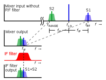 The unwanted frequency is called the image of the wanted frequency, because it is the "mirror image" of the desired frequency reflected about . A receiver with inadequate filtering at its input will pick up signals at two different frequencies simultaneously: the desired frequency and the image frequency. A radio reception which happens to be at the image frequency can interfere with reception of the desired signal, and noise (static) around the image frequency can decrease the receiver's signal-to-noise ratio (SNR) by up to 3dB.