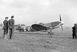 The main undercarriage legs, for the first time in the Spitfire's life, were fitted with forward-facing torque links. In addition, the leg doors were slightly concave, allowing the undercarriage to sit lower in the wheel wells when retracted: this meant the upper wing skinning was free of the small bulge which had hitherto been necessary to clear the wheels. The wheels themselves were a new strengthened Dunlop AH10019 "four spoke" pattern, replacing the "five spoke" pattern used since the first Mk Is. This revised undercarriage was also fitted on some mid to late Mk IXs and all Mk XVIs.[17] A retractable tailwheel (Dunlop 2184) was fitted, covered by small doors when in flight. This also applied to the PR Mk Xs and most PR Mk XIs.