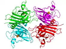 ![]() Ribbon diagram of bovine Cu-Zn SOD subunit[6] |