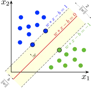If the training data is linearly separable, we can select two parallel hyperplanes that separate the two classes of data, so that the distance between them is as large as possible. The region bounded by these two hyperplanes is called the "margin", and the maximum-margin hyperplane is the hyperplane that lies halfway between them. With a normalized or standardized dataset, these hyperplanes can be described by the equations