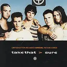 "Sure" is a single by British boy band Take That, released as the lead single from their third studio album, Nobody Else (1995). It was written by Take That's lead singer Gary Barlow and fellow band members Robbie Williams and Mark Owen.[4] Released on 3 October 1994 by RCA and BMG, the song became the band's fifth number one on the UK Singles Chart and has received a silver disc certification in the UK for selling over 200,000 copies. Q Magazine ranked "Sure" at number 86 in their list of the "1001 Best Songs Ever" in 2003.[5]
