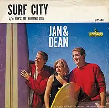 "Surf City" is a 1963 song recorded by American music duo Jan and Dean about a fictitious surf spot where there are "two girls for every boy".[1] Written by Brian Wilson and Jan Berry, it was the first surf song to become a national number-one hit.[2]