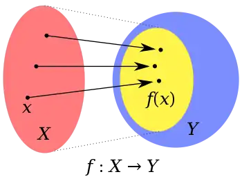 A non-surjective function from domain X to codomain Y. The smaller yellow oval inside Y is the image (also called range) of f. This function is not surjective, because the image does not fill the whole codomain. In other words, Y is colored in a two-step process: First, for every x in X, the point f(x) is colored yellow; Second, all the rest of the points in Y, that are not yellow, are colored blue. The function f would be surjective only if there were no blue points.