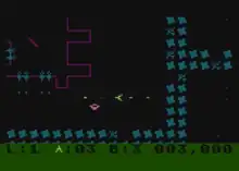 The player can be destroyed by the fortress guns, or any of the numerous moving enemies. These enemies can be destroyed with the ship's gun, or by using up one of the smart bombs, which destroy all of the enemies on the screen. Some enemies are also blocked by the protective wall, making them easy to avoid by shooting open only small passages in the walls. Others can move through the walls and present more of a challenge. Since some of the fort guns can only be attacked from angles that demand additional holes be punched in the walls, the play can become hectic.