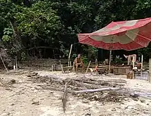 The tribe camp near the end of Survivor: Borneo. Tribes must build themselves basic shelters from natural resources and through reward items earned during the competition.