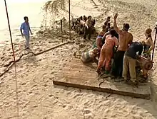 Tribes compete frequently in both mental and physical challenges to win rewards or immunity, such as this race to pull cannons during the first episode of Survivor: Pearl Islands.