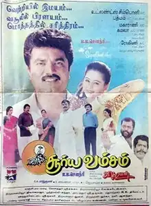 Surya Vamsam (transl. Solar dynasty) is a 1997 Indian Tamil-language drama film written and directed by Vikraman. The film stars R. Sarathkumar and Devayani, with Radhika, Manivannan, Priya Raman, Nizhalgal Ravi, Tharini, Ajay Ratnam, Jai Ganesh, Shiva and Anandaraj in supporting roles. It revolves around a traditional father and his illiterate son, following their tense relationship and shows how the strict patriarchy causes a drift between them.