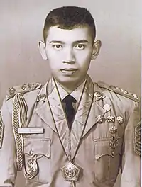 Yudhoyono spent three years at AKABRI and became the commander of the Cadet Corps Division there. He graduated from AKABRI as second lieutenant in 1973, and as the best graduate of the year, received the prestigious Adhi Makayasa medal from President Suharto.[14]