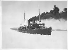 Although Wäinämöinen was an invaluable addition to the Finnish icebreaker fleet, she was not used as extensively as the smaller state-owned icebreakers due to her high fuel consumption and the shortage of coal shortly after the war. In addition to icebreaker duties she was used to transport volunteers across the Gulf of Finland to participate in the Estonian War of Independence.[6] In September 1919 she was drydocked in Suomenlinna, but while the repair work was completed in late October, she could not leave the shipyard until 24 November due to her deep draft and the particularly low sea level.[7] During the particularly harsh winter of 1922 she assisted 170 ships to and from the Finnish ports. Her last task under the Finnish flag was to open the South Harbour in Helsinki on 16 April 1922.[8]