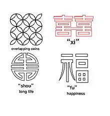 The overlapping coin with a square hole is a symbol of wealth. A favorite background is a series of overlapping circles which forms an all-over design of these coins.[12]