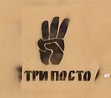 In February 2004, the arrival of Oleh Tyahnybok as party leader led a significant change in moderating the Social-National Party's image.[3][37] It changed its name to the All-Ukrainian Union "Svoboda",[3] and abandoned the "I + N" (Ukrainian «Ідея Нації» "Idea Natsii" = "idea of a nation") Wolfsangel logo (a symbol popular among neo-Nazi groups)[3][38] with a three-fingered hand reminiscent of the 'Tryzub' pro-independence gesture of the late 1980s.[38] Svoboda also pushed neo-Nazi and other radical groups out of the party,[39] distancing itself from its neofascist past while retaining the support of extreme nationalists.[37] Andrushkiv, former head of the party, rejected Tyahnybok's claim that Svoboda was successor party to the SNPU and called Svoboda 'a different political phenomenon.' Both he and Andriy Parubiy would leave the 'new' party following its transformation.[40]