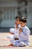 Dharma consists of religious and moral duties according to one's responsibilities and situation.[126] All Swaminarayan Hindus who are householders maintain five basic vows: abstaining from theft, gambling, adultery, meat, and intoxicants like alcohol.[127][128] As part of their dharma, swamis additionally endeavor to perfect the five virtues of non-lust (nishkam/niṣkāma), non-greed (nirlobh/nirlobha), non-attachment (nissneh/nissneha), non-taste (niswad/nissvada), and non-ego (nirman/nirmāna).[129][130] Another aspect of the practice of dharma is the Swaminarayan diet, a type of vegetarianism, similar to that practiced generally by Vaishnava sampradayas, that entails abstaining from animal flesh, eggs, onions, and garlic.[127]