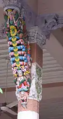 The mansion itself rests on octagonal and square wooden pillars on which Ardh-murt relief sculpture of flowers and creepers is engraved. Angles of wooden pillars, carved in free hand design and the shapely Bharnai, which balconies rest on. The Sabha mandap, an extensive Central Hall, has been constructed on sixty pillars. There are giant size madal-shilp sculptures on twelve high pillars in the front row on which rest the portico of the first floor, capture our attention with its great artistic appeal. These sculptors include a flying Hanuman lifting the Devgiri mountain in his palm; a pot bellied Ghanesha wearing a scarlet turban in the South Indian style, miniature sculptures of several soldiers armed and dressed in Marathi turbans and costumes and herds of monkeys have been created on the religious tradition in the wooden sculptors. Some sculptors depict the 1857 uprising, with the Rani of Jhansi and other heroes narrated in carvings of these pillars.[7] There are a total of 12 such pillars, which depict scenes such as a Maratha warrior fighting under the Rani of Jhansi in guise of Durga the Hindu goddess, Indian leader Tatya Tope in the guise of Narsimha, the lion headed form of Vishnu and that of parrots which tell the mood of the times.[10]