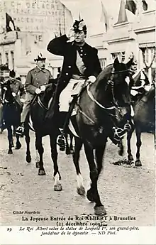 On December 23, 1909, just six days following the death of Leopold II, his nephew, Prince Albert, rode to the Palais de la Nation. In the same scene where his uncle had sworn in, he joined the royal family, who were already seated under their canopy.[19] The monarch, for the first time, gave his oath in Dutch to emphasize the bilingual nature of the kingdom secured by the Equality Act of 1898 (Loi du 18 avril 1898 relative à l'emploi de la langue flamande dans les publications officielles). After receiving a standing ovation from parliamentarians, Workers' Party representatives attempted to interrupt the ceremony with shouts of "Long live universal suffrage!" (Vive le suffrage universel!) However, the assembly quickly drowned out the disruptive voices with cheers of "Long live the king!" (Vive le roi!) During his self-written speech, the new king expressed a desire to improve colonial policy by implementing a program worthy of the Congo.[12] The next day, the royal couple attended a Te Deum ceremony at Saint-Michel-et-Gudule Cathedral.[14]