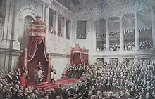 Seven days following Leopold I's death, his oldest son Prince Leopold was sworn in as Leopold II on December 17, 1865. He arrived on horseback at the Palace of the Nation with his brother Philippe and received enthusiastic public praise.[13] He then walked into an unadorned hemicycle. In accordance with the monarch's request, a ceremonial throne featuring armrests decorated with lions and a red velvet backrest inscribed with the national motto was positioned beneath a regal dais.[14] Present in the audience were not only the parliamentary body, but also cabinet members, judges, high-ranking civil servants, the bishopric, and the diplomatic corps. Despite its ornamental nature, the throne held no practical significance.[15] The royal family, attired in mourning, sat in a separate gallery accompanied by a large number of aristocrats as per the sovereign's request.[16][17] Upon delivering his speech and taking the oath,[18] the King and his son, the Duke of Brabant, emerged onto the balcony of the Royal Palace to observe a military parade on the Place des Palais. The ceremony was conducted amidst a joyful atmosphere of "indescribable enthusiasm."[12]