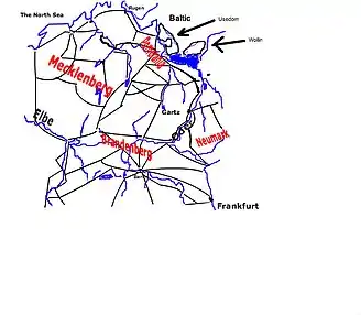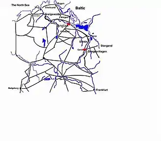 Meanwhile, stationed at Pasua and Elbing (to the far east), Oxenstierna was seeking to move towards the king. The cities that were critical to establishing a land route between the two armies was Kolberg (occupied by the Imperials) and Cammin. Knyphausen and Oxenstierna were entrusted with the task of establishing a land route between Prussia and Swedish occupied Pomerania.[61] Meanwhile, being August as it was, the king was contemplating the establishment of winter quarters.[61] However, the Administrator of Magdeburg, Christian William declared in favor of the Swedish, drove out the Imperial garrison and called the Swedes to aid the city. This was done without the king's prior knowledge, and there were many objects which the king deemed to be of higher importance than the city of Magdeburg. It is not likely the king would have encouraged such a move if he had been consulted about it. The king still wanted to march to the Elbe,[61] take possession of the duchy of Mecklenburg and engage in negotiations with Hamburg and Lübeck. Magdeburg was much too far away, and there were large contingents of Imperial troops between the Swedish army and Magdeburg. However, the king sent a colonel, Dietrich von Falkenberg, to the city and ordered him to bring the city into the highest level of defense for an anticipated siege by the Imperials.[62]