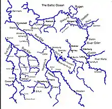 Ueckermünde and Barth (to the west of Stralsund) were also taken without incident.[58] Wolgast was besieged, and although the garrison gave up the city to the Swedes they held out in the citadel of the city.[58] This garrison hung onto the citadel until 16 August.[58] Treptow[57] was also taken.
