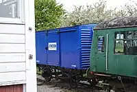 LMS PBA27 4-wheel ventilated van Unknown build date. Later used by the Port of Bristol Authority and numbered 27. Recently restored to operational condition and painted blue with a 'Jewson' logo. [14]