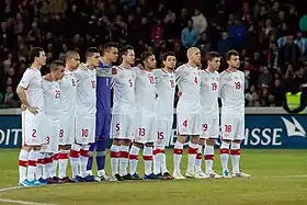 At Euro 2016, Switzerland were selected to play in Group A of the tournament; alongside hosts France, Albania and Romania. In the first game, Switzerland won 1–0 over Albania, with the only goal being scored by Fabian Schär in the 5th minute of the game.[73] The next match was a 1–1 draw with Romania, with Switzerland initially conceding from a penalty but equalizing in the second half following a goal from Admir Mehmedi.[74] The final group game was against France, drawing 0–0. However, the game spread notoriety for several Swiss players' jerseys being ripped during challenges with the French players, and also for the ball bursting during a challenge between Antoine Griezmann and Valon Behrami when they both converged on the ball, with the game also attracting attention for its poor surface, which was criticized by both coaches and players of the two teams; after the game, Switzerland's kit manufacturer had blamed "faulty material" for the incidents regarding the jerseys being ripped.[75][76][77] Switzerland, due to the draw, finished second in the group to set up a tie against Poland in the round of sixteen; initially the Swiss conceded but managed to find a late equalizer from Xherdan Shaqiri, who scored a bicycle-kick to send the game into extra-time, but the Swiss were knocked out as Granit Xhaka had missed the second penalty during the penalty shootout, as all other players managed to convert their penalties, with Poland winning 5–4 on penalties to go through and knock out the Swiss.[78][79][80] In qualifying for the 2018 FIFA World Cup, Switzerland were drawn with Portugal, Hungary, Faroe Islands, Latvia and Andorra.[81] The Swiss began their qualifying group with a shock 2–0 win over European champions Portugal, who had won the tournament less than two months prior to playing with them on 6 September.[82] Afterwards, they beat Hungary 2–3, Andorra 2–1, Faroe Islands 2–0, Latvia 1–0 in the first five games, leading the group on maximum points.[83][84][85][86] In the reverse fixtures, they beat Faroe Islands 2–0, Andorra 3–0, Latvia 3–0 and Hungary 5–2,[87][88][89][90] before facing Portugal in the final group game, where they lost 2–0,[91] meaning they would have to play in the play-offs; where they were ranked as the best second-placed team,[81][92] and were drawn to play Northern Ireland. In the first leg, played on 9 November, they won 1–0 through a controversial penalty scored by Ricardo Rodríguez, and three days later played in the second leg, drawing 0–0 and advancing to the World Cup finals in Russia with a 1–0 aggregate win.[93][94][95] Before the World Cup, Switzerland were ranked 6th in the world ranking, even ranking higher than eventual World Cup winners France.[96]