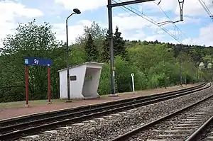 Sy railway station is a Belgian railway stop on Line 43 (Infrabel) (from Liège (Angleur) to Marloie), located in the village of Sy on the territory of the municipality of Ferrières, in the Walloon Region of the province of Liège. It is a railway stop of the National Railway Company of Belgium (SNCB) served by Omnibus (L) and Rush hour (P) trains.