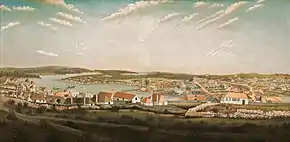 After arriving to Botany Bay, Captain Arthur Phillip decided that the area was not suitable since it had poor soil, no secure anchorage and no reliable water source.[13] Thus, the fleet moved to the more suitable Port Jackson where a settlement was established at Sydney Cove on 26 January 1788.[14] This date later became Australia's national day, Australia Day. The colony was formally proclaimed by Governor Phillip on 7 February 1788 at Sydney. Sydney Cove offered a fresh water supply and Port Jackson a safe harbour, which Phillip described as: "being without exception the finest Harbour in the World".[15] With the expansion of European settlement large amounts of land was cleared for farming, which resulted in the destruction of Aboriginal food sources. This, combined with the introduction of new diseases such as smallpox, caused resentment within the Aboriginal clans against the British and resulted in violent confrontations.[16]