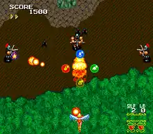 The game is a vertical-scrolling where players control the above flying woman (rather than a space ship which is typical of games from this genre).[2] Its gameplay is similar to previous shooters by Compile;[5] The player controls Silphia through eight stages over a constantly scrolling background, populated with an assortment of enemy forces and obstacles, and the scenery never stops moving until a boss is reached, which must be fought to progress further.[2][3][4] Stages have a mid-boss, and then an end boss at each stage.[3]