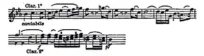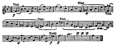 The second subject is, in the words of Donald Tovey, "a conversation between the bassoon, the oboe, and the flute."[17] The development section takes the tonality towards the remote key of B major before returning to the tonic B♭, and the recapitulation and coda follow the conventional classical form.[17]