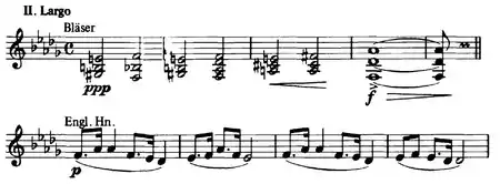The second movement is introduced by a harmonic progression of chords in the wind instruments. Beckerman interprets these chords as a musical rendition of the narrative formula "Once upon a time".[1] Then a solo cor anglais (English horn) plays the famous main theme in D-flat major accompanied by muted strings. Dvořák was said to have changed the theme from clarinet to cor anglais as it reminded him of the voice of Harry Burleigh. The movement's middle section contains a passage in C♯ minor evoking a nostalgic and desolate mood which eventually leads into a funeral march above pizzicato steps in the basses. It is followed by a quasi-scherzo that incorporates this movement's theme as well as the first movement's main and closing themes. The Largo is concluded with the soft return of the main theme and introductory chords.