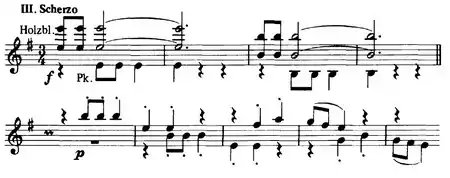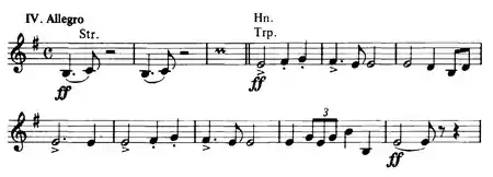 The final movement is also written in sonata form. After a brief introduction, the horns and trumpets declare the movement's main theme against sharp chords played by the rest of the orchestra. The second theme is then presented by the clarinet above tremolos in the strings. The development not only works with these two themes but also recalls the main themes of the first and second movements and a fragment of the Scherzo. Following the recapitulation which begins in the unexpected key of G minor but later corrects itself back to the original key, the movement reaches its climax in the coda, in which materials from the first three movements are reviewed for a final time while the Picardy third is expanded after the orchestra triumphantly plays a "modally altered" plagal cadence.[5] The main theme, especially its occurrence in bar 321, bears a close resemblance to the opening theme of the Hans Heiling Overture by Heinrich Marschner.