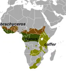 The African buffalo (Syncerus caffer) is a large sub-Saharan African bovine.[2] There are five subspecies that are recognized as being valid. Syncerus caffer caffer, the Cape buffalo, is the nominotypical subspecies, and the largest one, found in Southern and East Africa. S. c. nanus (the forest buffalo) is the smallest subspecies, common in forest areas of Central and West Africa, while S. c. brachyceros is in West Africa and S. c. aequinoctialis is in the savannas of East Africa. The adult African buffalo's horns are its characteristic feature: they have fused bases, forming a continuous bone shield across the top of the head referred to as a "boss".