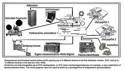 B) Soon after, in 1922-23, the synchro-ciné, expanding the connection possibilities of its central distributor, already became a complete synchronization system, in which the reading desk is only one of the many elements around the central element, the control band, circulating in the distributor gear, and which can automatically trigger various 'noise' devices (Ciné-bruiteurs) or 'noise-makers' (some designed by Delacommune himself and incorporated into the system in the patent), shoot piano players, gramophones, and various desks that are needed, up to a maximum of, it seems, 9 devices. The proof of the change of orientation in the machinery and final objectives is the fact that, although the reading desks remain a regular part of the system; however it is already perfectly possible to perform a performance without using at all (only with the capacity of the central distributor, and the connected noises devices). Also part of the system are the various procedures and methods that are registered to improve and facilitate the use of your procedure, throughout over time. It is called in the original patent the "Synchronismes Cinématographiques" system, although it was usually abbreviated as "Synchro-ciné" system, or even more usual "Delacommune system".