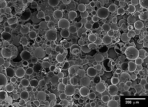 Syntactic foams are composite materials synthesized by filling a metal, polymer,[1] cementitious or ceramic matrix with hollow spheres called microballoons[2] or cenospheres or non-hollow spheres (e.g. perlite) as aggregates.[3][4] In this context, "syntactic" means "put together."[5] The presence of hollow particles results in lower density, higher specific strength (strength divided by density), lower coefficient of thermal expansion, and, in some cases, radar or sonar transparency.