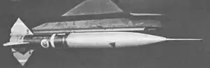 Skydart, designated TDU-12/B by the U.S. Air Force,[2] was developed by the Santa Barbara Division of Curtiss-Wright.[3] It was designed for use as a target for practice with infrared homing air-to-air missiles such as the AIM-9 Sidewinder and AIM-4 Falcon. It had a small cylindrical body fitted with four cruciform fins aft for control and fixed forwards canards to set the rocket's trajectory. Propulsion was by a dual-thrust boost-sustain solid-propellant rocket supplied by the Grand Central Rocket Company and the Hercules Powder Company. A gyroscopic-driven autopilot stabilized the rocket in flight.[4] An infrared flare was installed to provide signature enhancement for training purposes, and the rocket could be equipped with a telemetry system.[1] Skydart was designed to use a common launching rail and electronic connections to the launch aircraft as Sidewinder.[5] Launch would be undertaken at speeds between Mach 0.8 and 2.0. Design endurance was nominally 90 seconds, but in service 110-second endurance was demonstrated.[3]