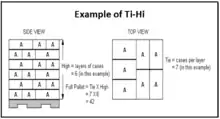 It refers to the number of boxes/cartons stored on a layer, or tier, (the TI) and the number of layers high that these will be stacked on the pallet (the HI).[1] It can also be used in reference to the stacking pattern used to load a pallet in order to generate a relatively stable stack.