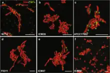- ↑ Soro, V. (2014). "Axenic Culture of a Candidate Division TM7 Bacterium from the Human Oral Cavity and Biofilm Interactions with Other Oral Bacteria". Applied and Environmental Microbiology. 80 (20): 6480–6489. Bibcode:2014ApEnM..80.6480S. doi:10.1128/AEM.01827-14. PMC 4178647. PMID 25107981.
