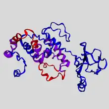 Predicted structure of TMEM171, with 4 transmembrane (purple), 3 cytosolic (blue), and 2 non-cytosolic (red) domains. Predicted by I-TASSER and viewed with EzMol.[26][27]