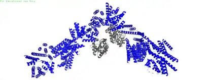 The human THO complex comprises six subunits, THOC1, −2, –3, −5, –6, and −7. Four of them have counterparts in Saccharomyces cerevisiae: THOC1 (yeast Hpr1), −2 (yeast Tho2), −3 (yeast Tex3), and −7 (yeast Mft1).[7][9] THOC1 is the first protein identified in THO complex. THOC2 is the largest subunit of TREX. It acts as a scaffold for the formation of the complex. The C-terminal domain of THOC2 directly interacts with nucleic acids. Mutational variants of THOC2 have been associated with syndromic intellectual disabilities, causing seizures, tremors, speech delays, and more.[10][11] THOC 3 and 6 both contains WD40 repeat motifs that allow interaction with other THO proteins.[12] THOC5 and THOC7 binds tightly and forms a dimer at their coiled coil domain (CCD). Four THO complexes form a tetramer, and each THO complex binds with one UAP56 protein at THOC2 and THOC1.
