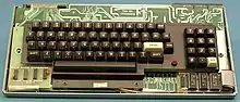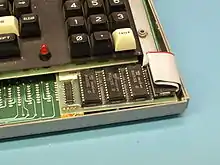The graphics are displayed at a resolution of 64×16 character positions on a screen measuring 7.5 inches (19 cm) wide and 6.625 inches (16.83 cm) tall.[52] Each character is composed of a 2×3 matrix of pixels, and corresponds to one byte of the 1 KB video memory used by the TRS-80. In each of those bytes, the first six bits control which pixel is displayed. The seventh bit is ignored, and the eighth toggles graphics mode.[51][53] The reason that the seventh bit is ignored is due to the company's decision to have only seven 2102 static-RAM chips installed on the computer's motherboard instead of eight to keep the manufacturing cost low.[54] Thus, there are no lowercase letters in the TRS-80 character set of an unmodified Model I, and the number of both graphics symbols and alphanumeric symbols is 64.[55] This can be worked around by deleting the unused bit and piggybacking an eighth 2102 chip onto another.[56] The alphanumeric symbols are displayed in 5×7 matrices of pixels.[51] The 1978 manual for the popular word processor Electric Pencil came with instructions for modifying the computer. Although the modification needs to be disabled for Level II BASIC, its design became the industry standard and was widely sold in kit form,[57] along with an eighth 2102 chip. Later models came with the hardware for the lowercase character set to be displayed with descenders.