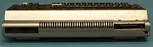 An alternative to cassette tape and floppy disk storage from Exatron sold over 4,000 units by 1981. The device is a continuous loop tape drive, dubbed the stringy floppy or ESF. It requires no Expansion Interface, plugging directly into the TRS-80's 40-pin expansion bus, is much less expensive than a floppy drive, can read and write random-access data like a floppy drive unlike a cassette tape, and it transfers data at up to 14,400 baud. Exatron tape cartridges store over 64 KB of data. The ESF can coexist with the TRS-80 data cassette drive. Exatron also made a complementary RAM expansion board that installed in the TRS-80 keyboard to increase memory to 48 KB without the EI.[66]