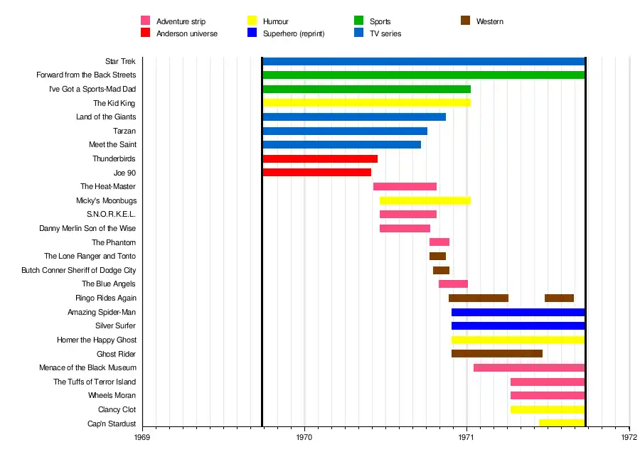 | The Phantom | Adventure | Lee Falk | 55 (10 October 1970) | 61 (21 November 1970) | Reprints of the King Features strip | |